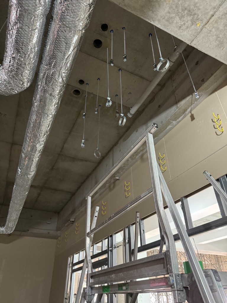 写真では、配管を通すために吊りボトルやバンドが整然と並び